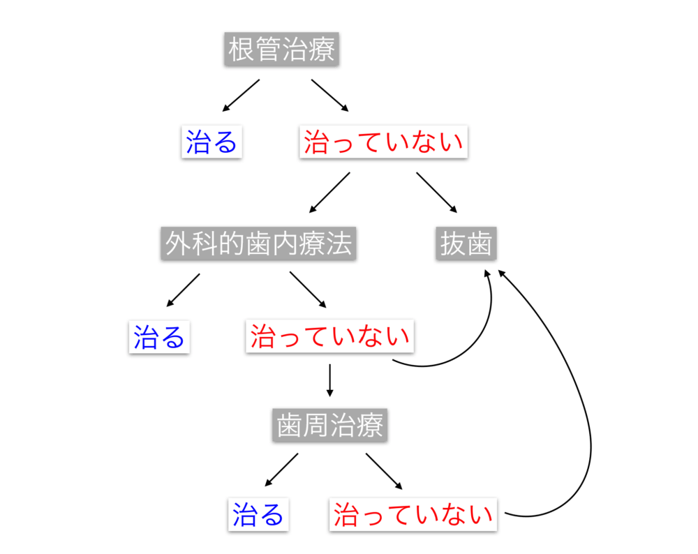 歯内歯周病変の治療には、根管治療と抜歯が挙げられます。もし、患者さんが根管治療を選択する場合は、以下のフローチャートのように治療を進めます。