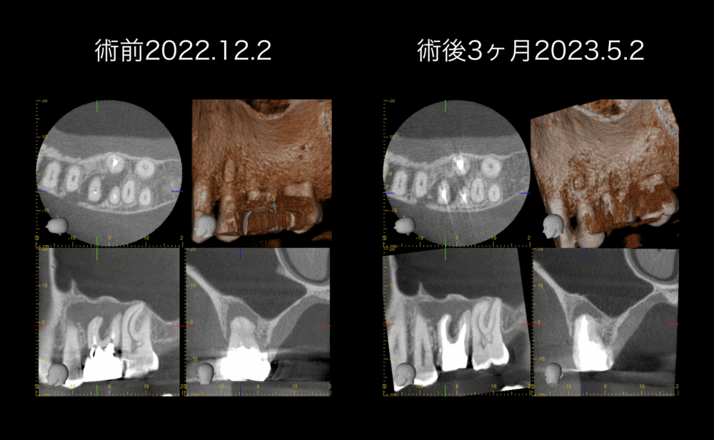 axial画像(CT画像左上)を比較すると、根尖部透過像は、縮小しています。また、右上の3D画像から、左上顎第二小臼歯根面の露出範囲が小さくなっています。頬側皮質骨の断続範囲が縮小しています。