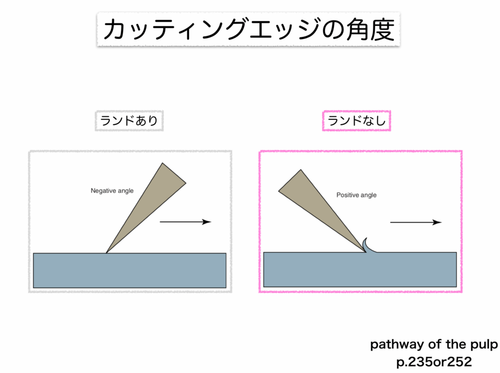 ランドがあると、左上の図のように、カッティングエッジが根管壁に対してほうきではくようなイメージで接触します。一方で、ランドがないファイルの場合は、根管壁に対してカッティングエッジはカンナで削るように接触します。