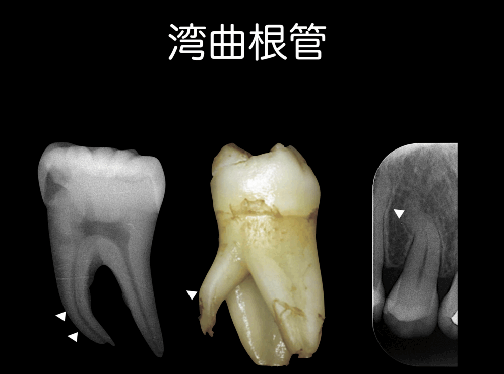NiTiファイルはステンレススチールファイルに比べると、湾曲根管を形成しやすくなりましたが、NiTiファイルでも太くなると剛性*4が高くなり、下の図のような湾曲根管の根尖まで形成するとなると、ファイルが破折する可能性が高くなります。
