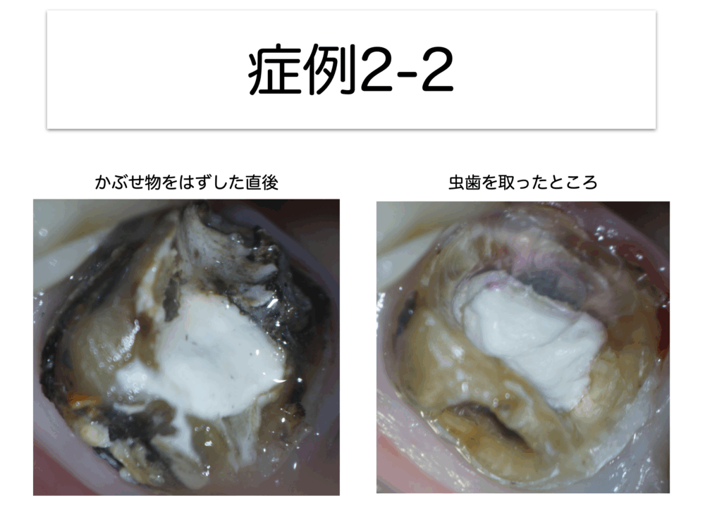 症例2-2左の写真は、かぶせ物をはずしたところで、黒いところが虫歯です。