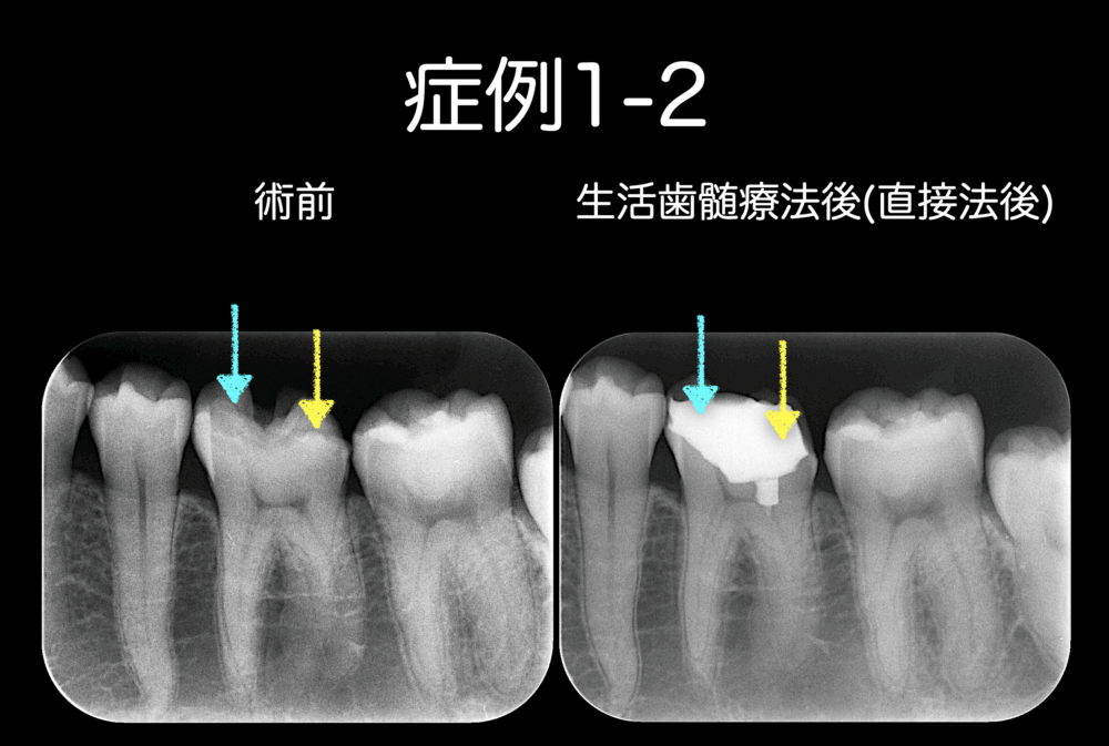 症例1-2は生活歯髄療法前後のレントゲン写真です。