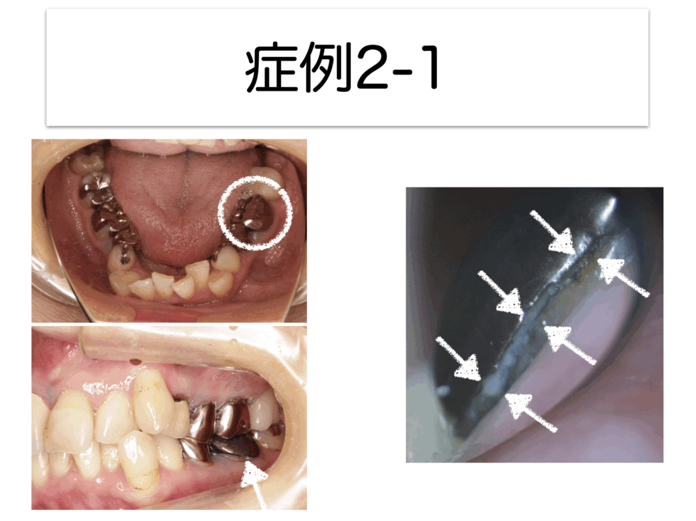 症例2-1左上写真の◯で囲っている歯の銀歯のフィット感が良くありません(症例2-1右写真)。