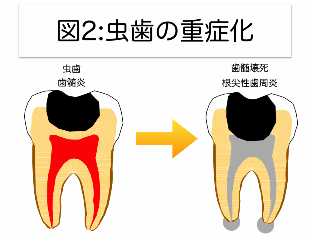 なんていう病気が歯を崩壊させていくのか、虫歯が重症化するとどうなるか、図2に示します。
