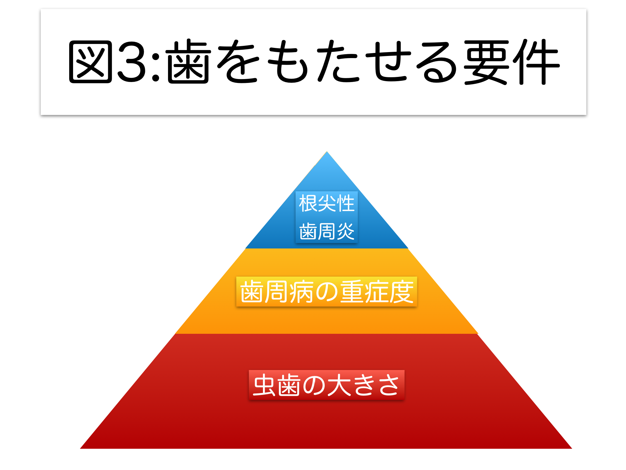 図3の三角形は、歯をもたせるために検討すべき要件の重要度を面積の広さで示しています。