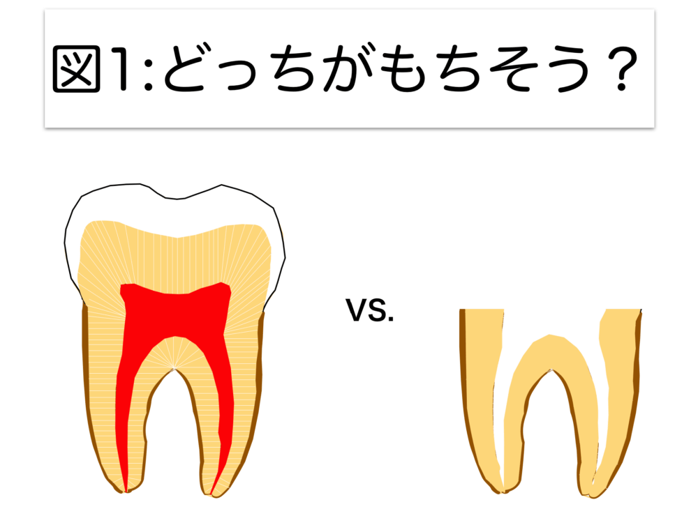 虫歯にならないことが一番大切ですが、虫歯になったとしても、左の図に近い形で残せる状況の方が、歯をもたせるには好条件です。