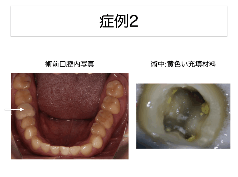 左の写真の矢印の歯が患歯です。仮歯を外して根管治療を開始しましたら、右の写真の黄色い材料が見られました。この黄色い材料はよく使われる根管充填材料で、ビタペックスという暫間的に使用される材料です。一般的には乳歯の根管充填で使用されます。永久歯の根管充填にはガッタパーチャというゴムのような材料を使います。前医がビタペックスを使用した理由は、おそらくですが、根管治療中に痛みが取れていないので、症例1と同じような目的で、粗造な材料によって圧抜きしたかったのではないかと考察しています。しかし、基本コンセプトを遵守した根管治療における根管充填は、細菌を根管内に埋葬し、根の先に細菌を行かせないようにするために、根管を材料によって隙間なく詰めていきます。基本コンセプトを遵守した根管治療によって、根管を除菌し切っているにもかかわらず痛みが取れないのであれば、根管治療を修了させ、外科的歯内療法で痛みを取ります。