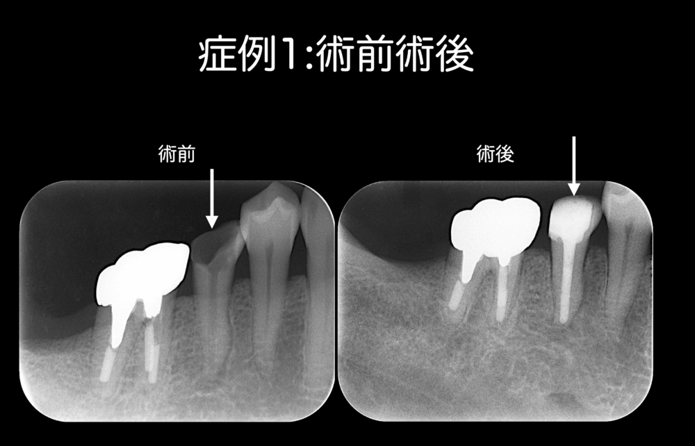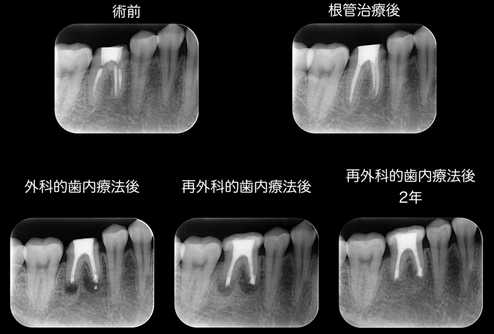 根管治療中から継続した痛みがあり、薬を詰めてはいる(根管充填)けれど、痛みが依然として残っていて外科的歯内療法で痛みが改善した症例です。